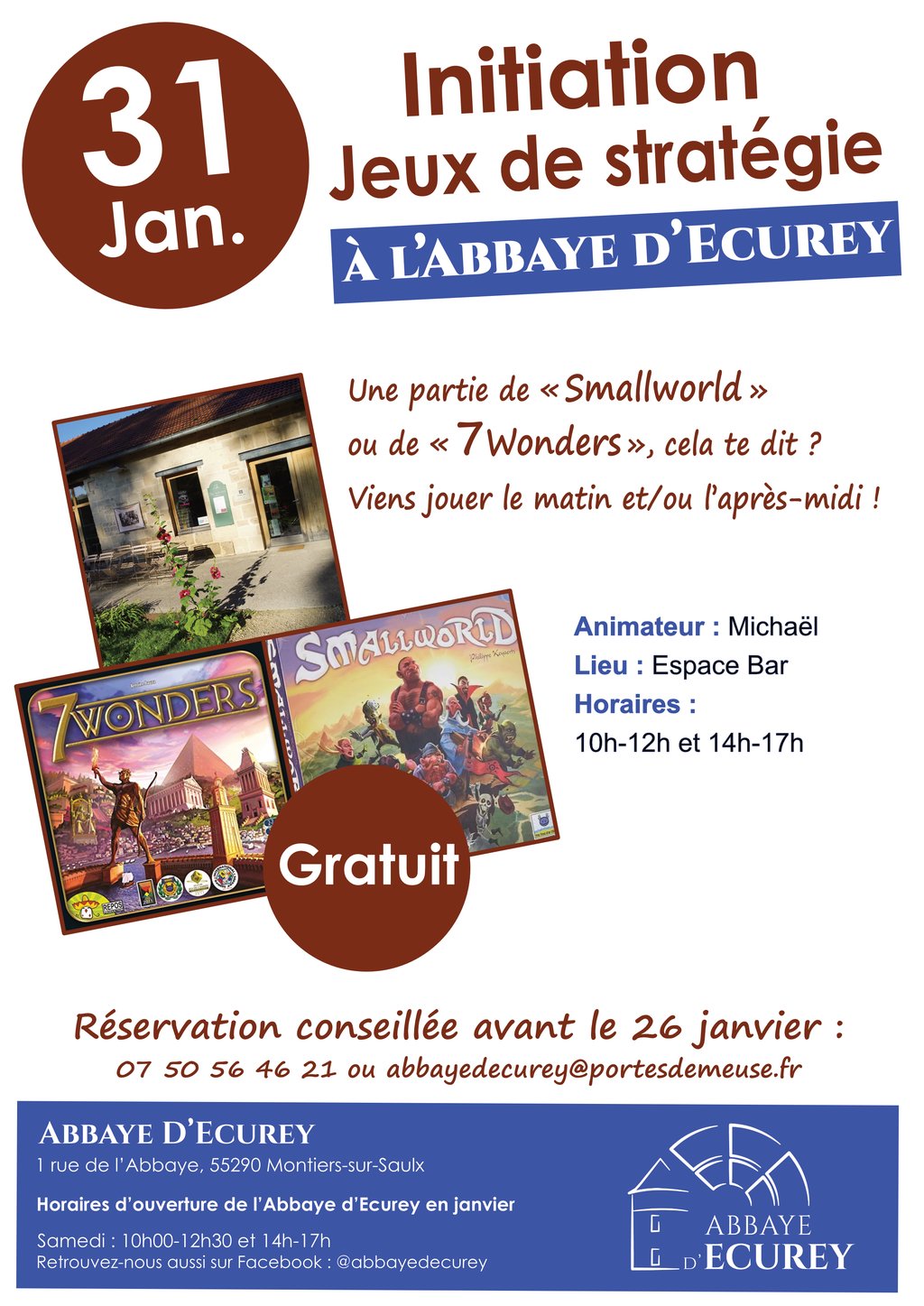 👋Le 31 janvier, nous vous invitons à venir jouer à des jeux de stratégie avec Michaël à l'espace bar de l'Abbaye d'Ecurey de 10h à 12h et/ou de 14h à 17h.